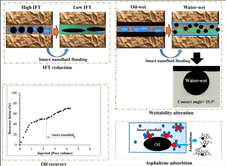 - Наночастицы разрушают скопления нефти снаружи и изнутри, создавая условия для эффективного вытеснения.