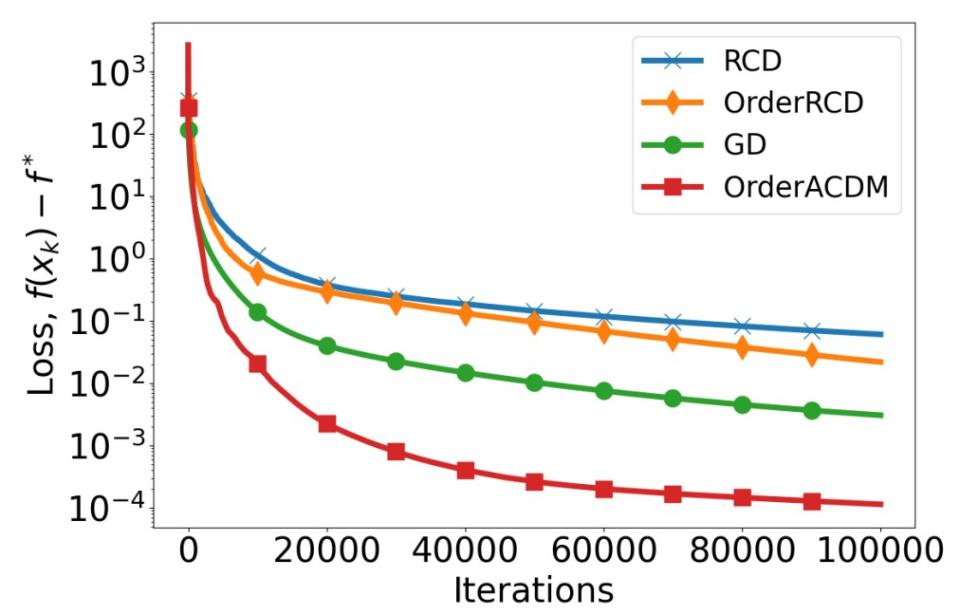 - OrderRCD превосходит аналогичный метод первого порядка RCD, а OrderACDM достигает большей скорости сходимости.