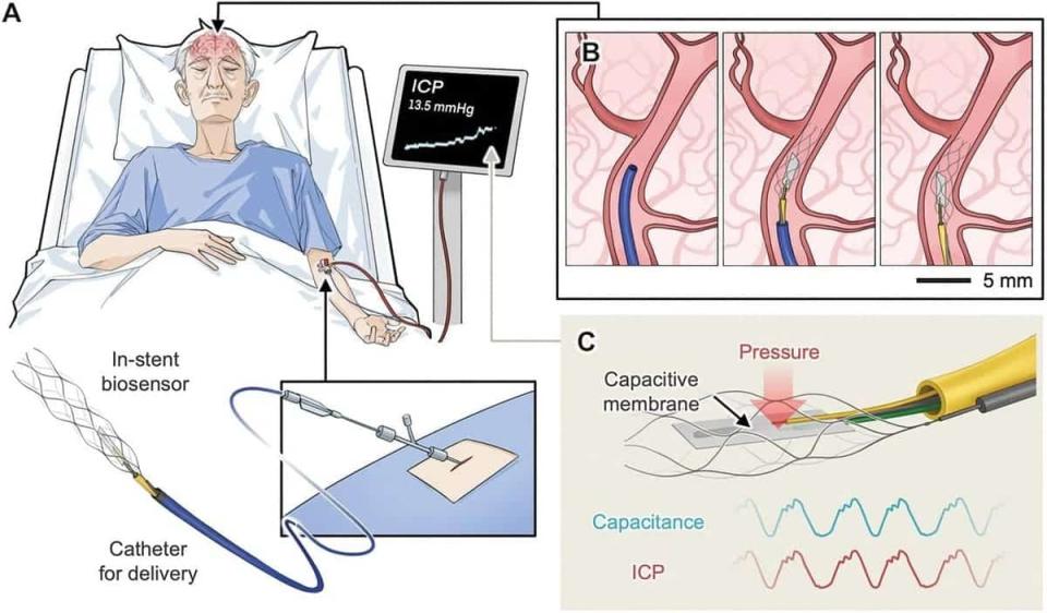 Биосенсорная система, помещенная в катетер, достигает твердой мозговой оболочки и беспрепятственно там развертывается / © Jimin Lee et al.