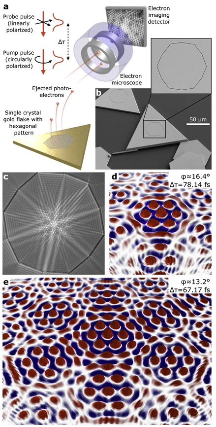 Изображение: Сверхбыстрая время-разрешенная векторная микроскопия плазмонных мешков скирмионов; a) 2PPE-PEEM метод измерения; b) РЭМ-изображение золотой пластинки; c) обработанное изображение плазмонных возбуждений, фотоэмиссионная электронная микроскопия: d, e) реконструированные компоненты векторного поля поверхностных плазмон-поляритонных скирмионных мешков при различных углах закрутки φ. Векторы скирмионных мешков. Положительная 𝑧-компонента выделена красным, отрицательная — синим / © Schwab, J., Neuhaus, A., Dreher, P. et al., arXiv:2411.03032