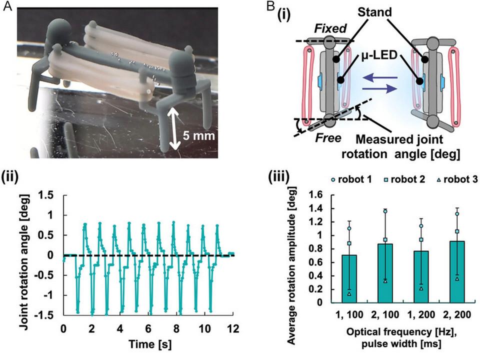 A) Полностью собранный четвероногий шагающий биогибридный робот в питательной среде. (B(i)) Схема метода измерения угла. (B(ii)) Изменение угла вращения сустава (1 герц, 100 миллисекунд, одно мышечное кольцо на сторону). (B(iii)) Средние изменения угла вращения сустава при различных частотах стимуляции и длительностях импульса (одно кольцо на сторону), измеренные на трех роботах (роботы 1–3), каждый из которых приводился в движение отдельной антагонистической парой мышечных колец, изготовленных в одной партии.