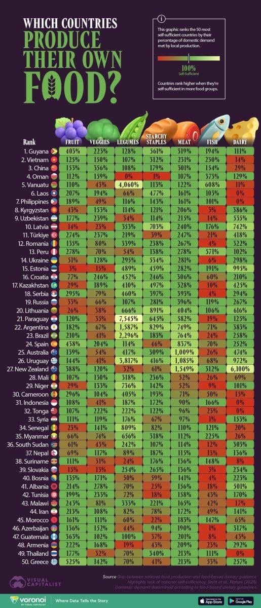 - Инфографика представляет рейтинг 50 стран с максимальной продовольственной независимостью.