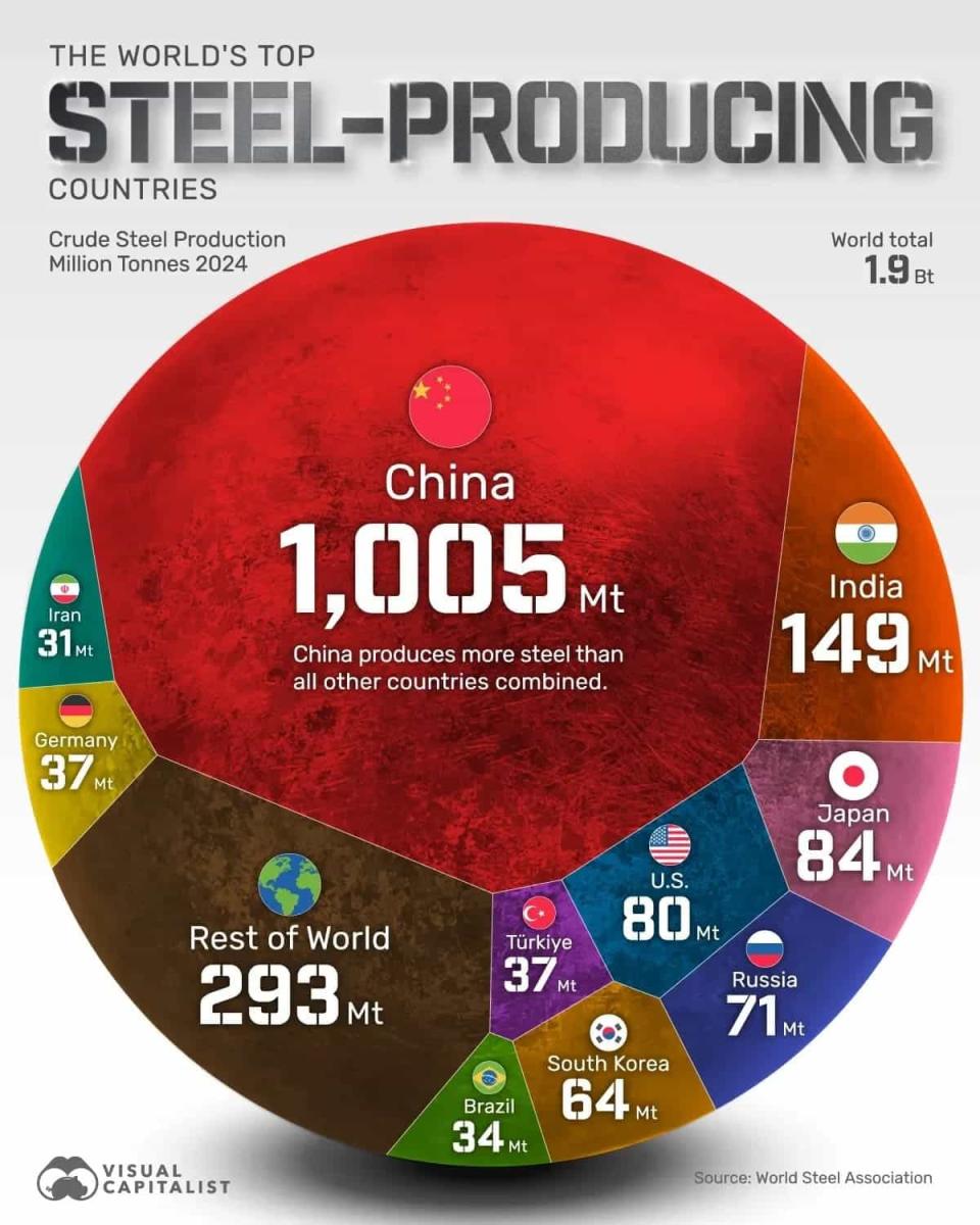 - Россия замыкает пятерку лидеров с производством 71 миллиона тонн стали.