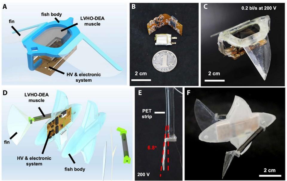 (A) Схема робота-манты с плоским актуатором LVHO-DEA. (B) Фотография электронной платы (сверху), аккумулятора (посередине) и монеты в один юань (снизу) для масштаба. (C) Фотография собранного робота-манты. (D) Схема автономного мягкого робота в форме луны-рыбы с цилиндрическими актуаторами, работающими в режиме изгиба. (E) Цилиндрический актуатор LVHO-DEA с пассивной полоской, изгибающийся при 200 вольтах. (F) Фотография собранного автономного мягкого робота в форме луны-рыбы