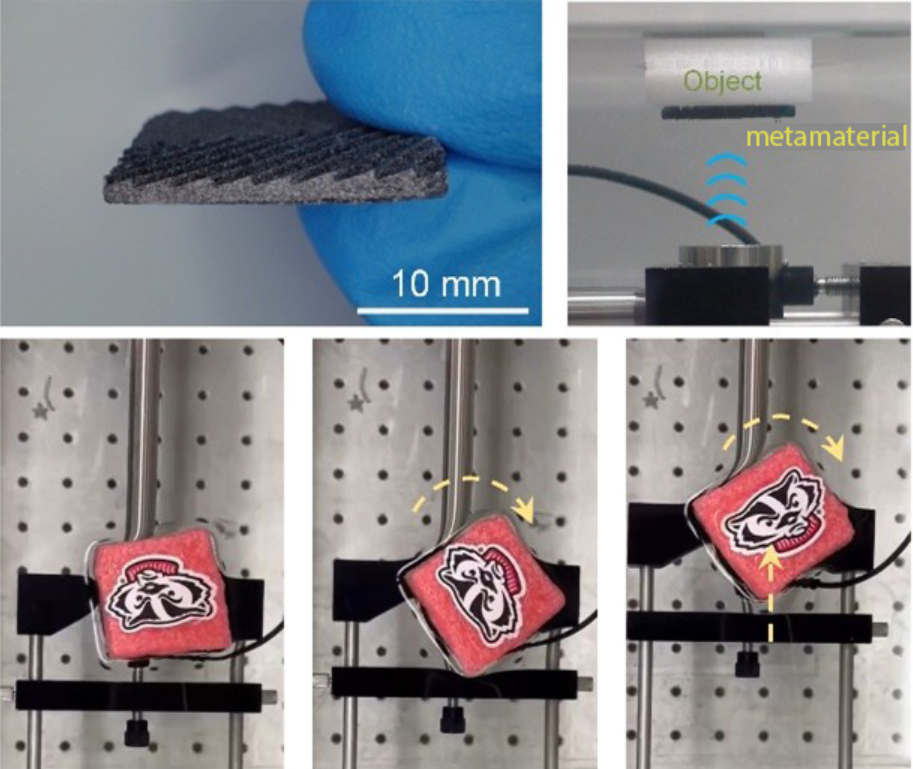 The metamaterial created by Zhang is used to push and rotate an object adorned with the University of Wisconsin’s Bucky the Badger. Credit – Dajun Zhang.