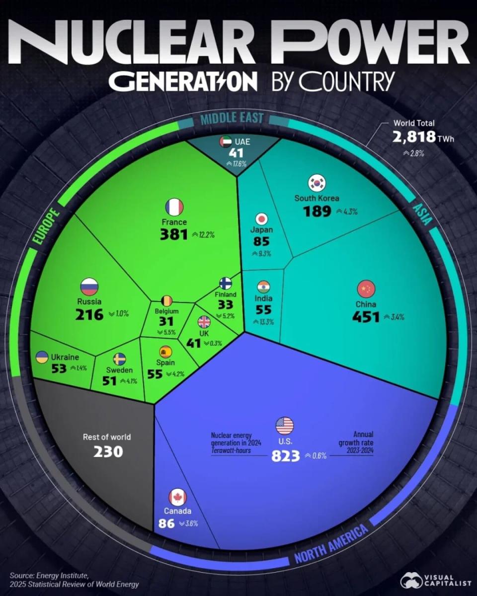 - Китай быстро поднялся на второе место, строя новые блоки и расширяя парк реакторов.