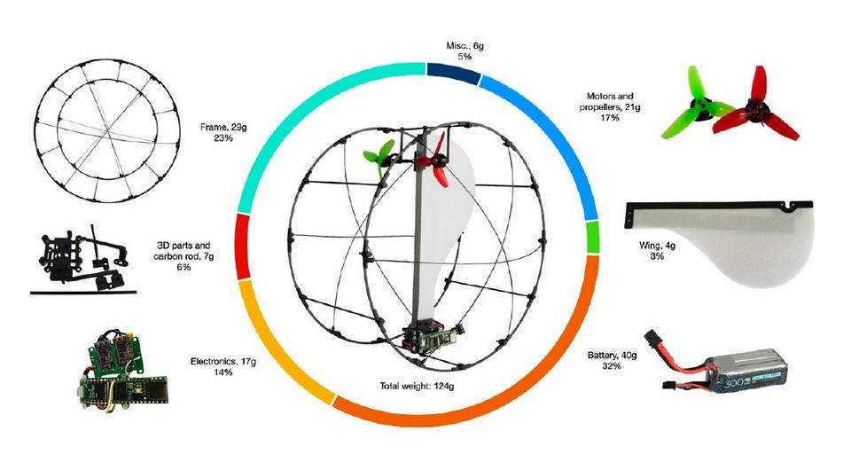 - Робот состоит из внешнего каркаса, внутри которого установлено единственное крыло и два электромотора с пропеллерами.