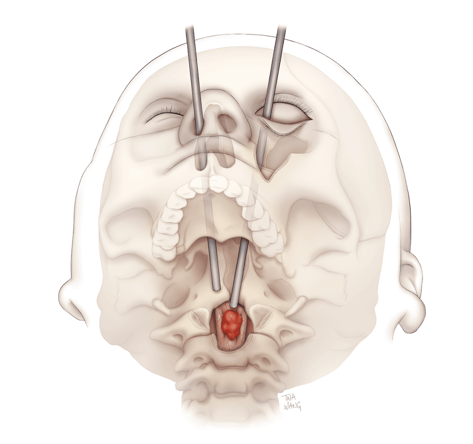 - Хирурги удалили опухоль по частям через обе ноздри и глазницу, используя сверла, диссекторы и эндоскопические инструменты.
